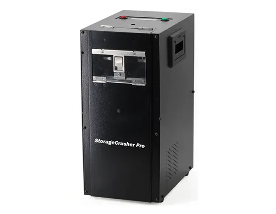 専用の物理破壊装置でHDDやSSDを破壊します。特にSSDについては内部ICを作動できない状態まで破壊します。
