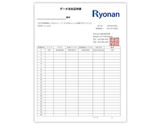 サービス完了時に、データを完全に消去したことを証明する「データ消去証明書」を発行いたします。