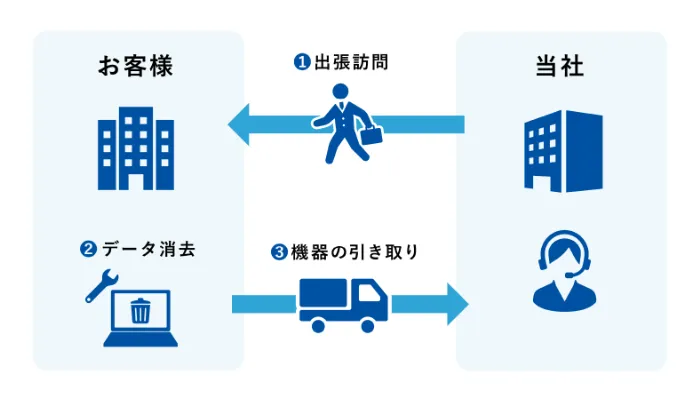お客様のオフィスや施設へ専門スタッフが訪問し、お客様の目の前でデータ消去を実施いたします。