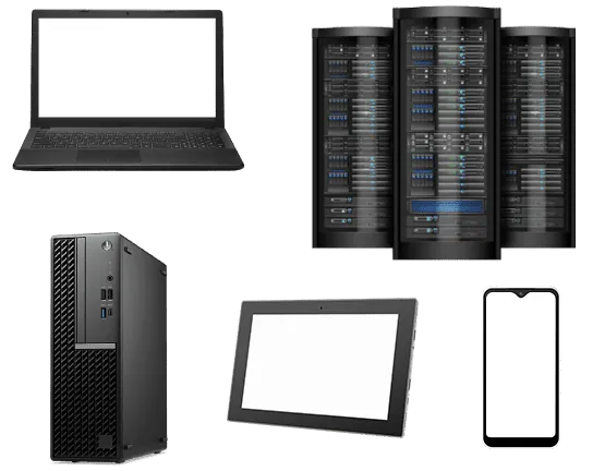 パソコン、サーバー、タブレット、スマートフォンの買い取り、データ消去を一括で対応可能。